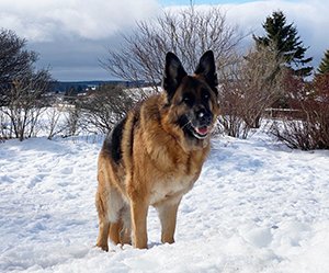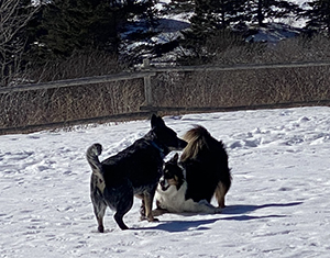 The skies were overcast but the temperature climbed steadily till it was six degrees above freezing for most of the afternoon. We did what we enjoy the most, play in the snow and make good use of our new paths, chasing one another and wrestling in the drifts.